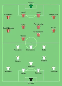 - Delanteros: Cristiano Ronaldo (239), Karim Benzema (229) y Gareth Bale (189) —«la BBC»,[28][29] como principales artífices goleadores—, con sustento de otros como Lucas Vázquez (136) o Jesé Rodríguez (92) en diversos momentos.