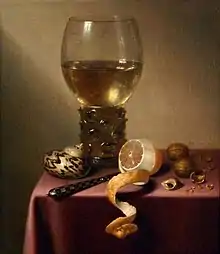 - Bodegón con vaso, limón, pelado, nueces y caracola en tapete rojo. 1626-1644, óleo sobre panel, 49 x 40 cm, Musée des Beaux-Arts de Reims.[3]