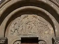 La Puerta del Perdón, tiene en el tímpano escenas del Evangelio, que aunque parece una sola escena están labradas en tres piedras distintas. En el centro está representado el Descendimiento con San Juan sosteniendo el cuerpo de Cristo, mientras se ve a María besando la mano de su hijo ya desclavada de la cruz, hay también otro personaje que está arrancando, con unas tenazas, el clavo de la otra mano, en la parte superior de esta escena aparecen dos ángeles con incensarios. La escena de la Resurrección está compuesta por las tres Marías y un ángel que les muestra el sepulcro de Cristo vacío. En la otra escena de la Ascensión se representa a Cristo subiendo a los cielos, entre dos de sus discípulos que tratan de retenerlo. Todas estas escenas están realizadas con cierta ingenuidad muy personal del autor, con los rostros anchos e inexpresivos y los pliegues de la ropa redondeados típicos de todas sus obras. En los capiteles, los hay de temas con aves entrelazadas con tallos en los que aparecen monstruos y con fondos de hojas de tipo corintio, todos con gran efecto decorativo. Otros capiteles son historiados y se observan luchas de hombres medio desnudos; esta interpretación es menos clásica que la de su maestro de Jaca, las ropas están tratadas con pliegues suaves así como los rostros también son anchos como los de las escenas del tímpano.[1]