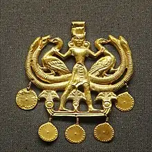 El motivo también ocupa un lugar destacado en la parte superior del famoso cuchillo de Gebel el-Arak, un cuchillo de marfil y pedernal que data del período Naqada II d de la prehistoria egipcia, que comenzó c. 3450 a. C. Aquí una figura vestida de Mesopotamia, a menudo considerada como un dios, lucha con dos leones. Se ha relacionado con el famoso sello Pasupati de la civilización del valle del Indo (2500-1500 aC), que muestra una figura sentada en una postura de yoga, con un tocado con cuernos (o cuernos) y rodeada de animales.[9] Esto, a su vez, está relacionado con una figura en el caldero de Gundestrup, que se sienta con las piernas parcialmente cruzadas, tiene astas, está rodeada de animales y agarra una serpiente en una mano y un torque en la otra. Este famoso y desconcertante objeto probablemente data del 200 a. C., o posiblemente hasta el 300 d. C., y aunque se encontró en Dinamarca, quizás se fabricó en Tracia.
