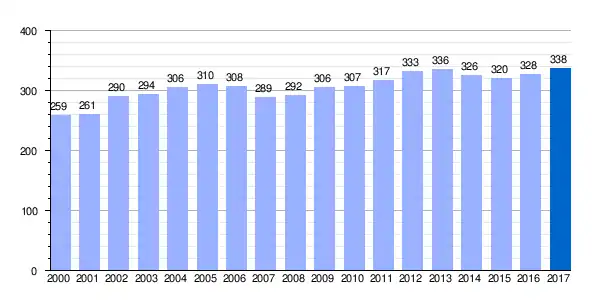 Gráfica de evolución demográfica de Maestu[3] entre 2000 y 2017 |