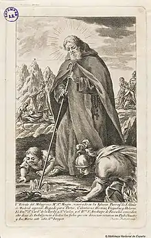 ![]() Joaquín Ballester, aguafuerte. Inscripción: «V.º Retrato del Milagroso M.r S.n Magín venerado en la Iglesia Parroql de S. Ginés de Madrid, especial Abogado para Partos, Calenturas, Hernias, Virguelas y Dolores». Biblioteca Nacional de España. | ||