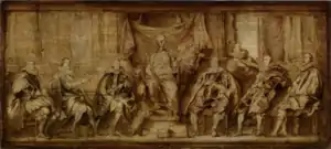 Se identificó la pieza como un boceto preparatorio de Van Dyck para la obra Magistrados de Bruselas, de 1634-35, que fue destruida en el bombardeo francés de Bruselas de 1695. [3] Su composición se conoce a partir de un boceto en grisalla conservado en la Escuela de Bellas Artes de París (Los concejales de Bruselas alrededor de la estatua de la justicia), que Van Dyck preparó para mostrar cómo planeaba diseñar el trabajo, que consistía en un retrato colectivo de siete magistrados del consejo situados alrededor de una estatua representando a la justicia. [4]