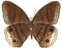 El tórax es color castaño oscuro, con líneas con aspecto de pelos en el abdomen; las alas miden en promedio 21,2 mm en los machos y 20,6 en las hembras; la coloración general de las alas es marrón con dos líneas verticales oscuras en cada ala claramente visibles en el dorso y más notorias en el dorso de las hembras, que tienen coloración más oscura en el vientre. Presentan ocelos rodeados de un anillo amarillo en la parte inferior de las alas posteriores dorsales, uno muy nítido en la parte ventral, negro con borde naranja y centro grisáceo. Tienen en el ala posterior un borde ancho blanco que se extiende desde los ocelos posdicales hasta el margen de las alas; también, dos puntos en los ocelos de la parte ventral de las alas.[1]