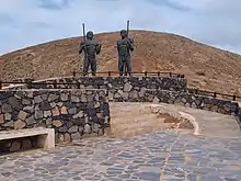 - La «villa» nombrada es Betancuria, antigua capital de la isla en tiempos de Juan de Abréu Galindo.[12] Por su parte, la existencia de otra muralla en el istmo de la Pared que une la península de Jandía con el resto de la isla ha hecho suponer el límite de los reinos en este punto. Sin embargo, en documentos del siglo xvii se hace alusión a las comarcas de Guise y Ayose como demarcaciones de la isla, con una pared que las dividía que iba desde el Puerto de la Peña en Ajuy al oeste hasta el Puerto de la Torre cerca de Las Salinas al este, y que debe corresponderse con la indicada por Abréu Galindo como verdadera frontera entre los reinos majoreros.[13]