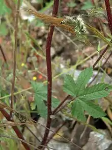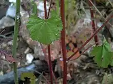 Planta de hasta algo más de 1 metro, anual. Generalmente erecta con ramificación. Tallo de glabrescente o sin pelo a pubescente. Las hojas son con forma redondeada (muy poca indentación), alternas y pecioladas en la base, en la parte media del tallo son palmatífidas (con una indentación más pronunciada), alternas y pecioladas, y en los extremos de los tallos son bilobuladas con una indentación profunda que llega a la base del peciolo.