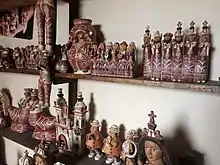 El repertorio de su obra artística se compone de iglesias de techo protectoras del hogar; animales propiciadoras de la abundancia como toritos, tarucas, venados, ovejas; criaturas míticas como sirenas, jarkachas y ukumaris; personajes icónicos como los chunchos, músicos y cocineras; utensilios de uso cotidiano y juguetes.