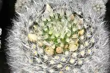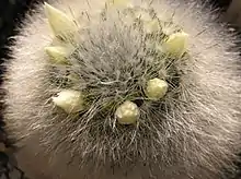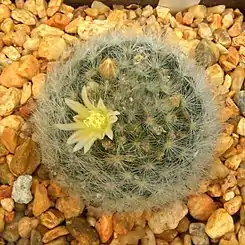 La biznaga changuitos (Mammillaria albicoma) es una planta de la familia de las cactáceas del orden Caryophyllales. La palabra Mammillaria viene del latín ‘mam[m]illa’ pezón o teta y de ‘aria’ que posee, lleva, es decir, cactáceas con mamilas. La palabra latina ‘albicoma’ es por las palabras latinas ‘albus’ blanco y ‘coma’ pelo, crin, es decir, "biznaga con pelos blancos". Es endémica de México.[2][3][4]