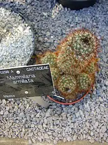 Mammillaria: nombre genérico que fue descrita por vez primera por Carolus Linnaeus como Cactus mammillaris en 1753, nombre derivado del latín mammilla = tubérculo, en alusión a los tubérculos que son una de las características del género.