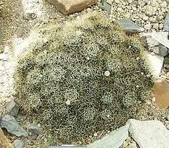 Es una planta perenne carnosa y globosa con las hojas transformadas en espinas, de color verde y con las flores de color blanco.