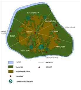Con una superficie de 51,8 km²; es la segunda isla más grande después de Rarotonga. Se considera la isla volcánica más antigua del Pacífico, con rocas de 19 millones de años de antigüedad. Está rodeada por un anillo de arrecifes de coral fosilizados, que llega a los 60 metros de altitud, separando el interior de la costa. La altitud máxima de la isla es el monte Rangimotia con 169 metros sobre el nivel del mar.