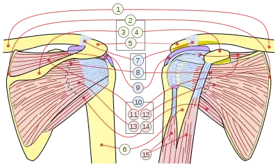 Articulación del hombro. Vista posterior a la izquierda. Vista anterior a la derecha. 1. Clavícula, 2. Escápula (con 3. Espina de la escápula, 4. Apófisis coracoides, 5. Acromion), 6. Húmero; Articulaciones: 7. Acromioclavicular, 8. Glenohumeral; 9: Bolsa sinovial; 10. Manguito de los rotadores (con 11. Supraespinoso, 12. Subescapular, 13. Infraespinoso, 14. Redondo menor), 15. Bíceps braquial
