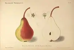 ![]() La pera 'Mantecosa de Roma' sinonimia: 'Römische Schmalzbirne', dibujo de Wilhelm Lauche. | ||