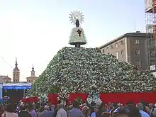 - El 12 de octubre, festividad del Pilar, es tradición en Zaragoza la celebración de la ofrenda de flores por la que el pueblo ataviado con trajes regionales obsequia a la Virgen flores de diversos tipos y en muy variadas composiciones. Desde hace unos años el ayuntamiento instala en la plaza del Pilar una estructura metálica con la forma de la Virgen en la que se confecciona un manto de flores con las que van entregando los oferentes. Se calcula que su número alcanza los siete millones de flores. En 2019 un conjunto de 24 jardineros, cien auxiliares de jardinería y otros 135 colaboradores se encargaron de cubrir la estructura metálica que contaba con más de 440 metros cuadrados de superficie. [4]