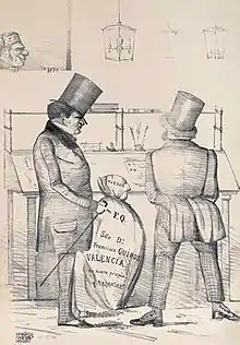 ![]() Manuel del Río y Francisco Quirós (de espaldas). Reproducción de una lámina de la obra de Williez (1855). | ||