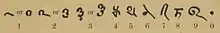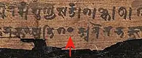 El manuscrito de Bajshali utiliza numerales con un sistema de valor posicional, utilizando un punto como marcador de posición para el cero.[14] El símbolo del punto llegó a llamarse shunya-bindu (literalmente, el punto del lugar vacío). Las referencias a este concepto se encuentran en Vasavadatta de Subandhu, que ha sido fechado entre 385 y 465 por el erudito Maan Singh.[15]