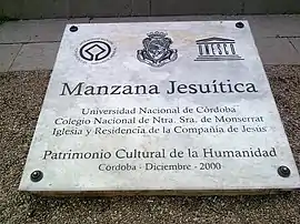 ![]() Placa en conmemoración de la declaración de la Manzana Jesuítica como Patrimonio de la Humanidad en 2000. Ubicada dentro de la Manzana Jesuítica, en Córdoba (Argentina). | ||