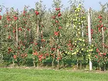 La siembra de alta densidad se hizo popular en las décadas de 1960 y 1970, y es un método común de cultivo de manzanas de sidra fuera del Reino Unido.[45] El huerto de alta densidad promedio contiene alrededor de 1.000 árboles por acre, aunque algunos huertos en Europa y el noroeste del Pacífico pueden contener hasta 9.000 árboles por acre.[46] Los árboles en huertos de alta densidad son injertados en un precoz portainjerto enano que mantiene el árbol pequeño y fomenta la producción temprana de frutos, con árboles que a menudo tienen dentro de dos a tres años de plantación. Esto permite a los cultivadores llevar nuevas variedades de manzana al mercado más rápidamente de lo que podrían con diseños de huertos tradicionales y más espaciados que son más lentos de madurar. Debido a que los árboles cultivados en un portainjerto enano son pequeños y delgados, deben ser apoyados por un sistema de enrejado. Las filas se espa espaciados dependiendo de la altura del árbol maduro, por lo general la mitad de la altura del árbol más tres pies (aproximadamente 1 m).[47] Los huertos de alta densidad son más eficientes en la mano de obra que los huertos tradicionales, ya que los trabajadores no necesitan subir escaleras durante el mantenimiento o la cosecha.[46] La aplicación de plaguicidas también es más eficiente, ya que los productos químicos pueden ser aplicados por pulverizadores sobre la fila, sistemas fijos de dosel,[48] u otros dispositivos que reducen los desechos de pesticidas.