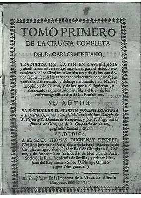 Martín José de Izuriaga, maestro cirujano de Pamplona, en torno a 1741, encarga al taller de María Francisca de Neira la impresión de los dos primeros tomos de la Cirugía de Carlos Musitano, que aquel ha traducido del latín.