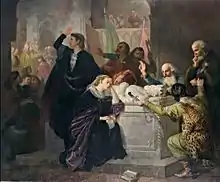 Carlos II no detuvo a María ni su madre, quien continuaron viviendo en el palacio real en Buda.[58] La reina madre Isabel y Nicolás Garai decidieron en secreto deshacerse de Carlos II.[59][60][61] Convencieron a Blaise Forgách, maestro de los coperos, de unirse a ellos y le prometieron el dominio de Gimes (hoy Jelenec, Eslovaquia) si asesinaba al rey.[62] Por petición de la reina Isabel, Carlos II la visitó y a su hija el 7 de febrero de 1386.[62] Durante la reunión, Blaise Forgách atacó al rey, hiriéndole gravemente en la cabeza.[62][63] Carlos II fue llevado a Visegrád, donde murió el 24 de febrero.[59]