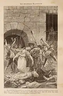 Durante las masacres de septiembre, las prisiones fueron atacadas por los habitantes, siendo los prisioneros conducidos ante tribunales improvisados compuestos por ciudadanos revolucionarios, quienes los juzgaron y ejecutaron sumariamente. A cada prisionero se le formulaban una serie de preguntas, tras lo cual era liberado con las palabras «vive la nation» («viva la nación») o sentenciado a muerte con la expresión «conducidlo a la Abadía» o «dejadlo ir», tras lo cual el condenado era llevado a un patio y asesinado por una multitud compuesta por hombres, mujeres y niños.[2] Las masacres contaron no obstante con la oposición de los trabajadores de las prisiones, quienes permitieron escapar a muchos de los presos, particularmente a las mujeres. De aproximadamente doscientas mujeres encarceladas, sólo dos fueron asesinadas en prisión.[2]