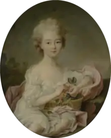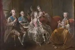 Retrato de la familia del duque de Penthièvre, por Jean-Baptiste Charpentier (1768). De izquierda a derecha: Luis Juan María de Borbón, duque de Penthièvre; su hijo Luis Alejandro de Borbón, príncipe de Lamballe; su nuera María Teresa, princesa de Lamballe; su hija Luisa María Adelaida de Borbón, futura duquesa consorte de Orleans; y su madre María Victoria de Noailles, condesa de Toulouse y marquesa de Gondrin.