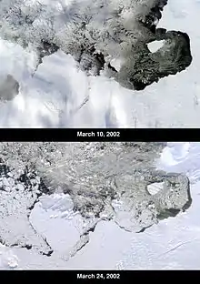 Un estudio realizado en octubre de 2004 sugirió que debido a que el hielo en el mar de Amundsen se había derretido rápidamente y estaba lleno de grietas, la plataforma de hielo en alta mar estaba lista para colapsar "dentro de cinco años". El estudio proyectó un aumento del nivel del mar de 1,3 m desde la capa de hielo de la Antártida occidental si todo el hielo marino del mar de Amundsen se derritiera.[3]