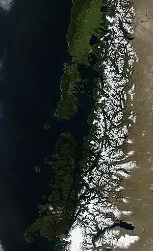 Vista satelital del mar de Chiloé, localizado entre la isla Grande de Chiloé y provincia de Palena.