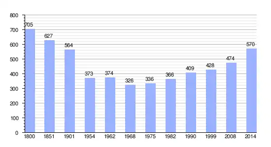 Los datos demográficos contemplados en este gráfico de la comuna de Marans[4] se han cogido de 1800 a 1999 de la página francesa EHESS/Cassini, y los demás datos de la página del INSEE.[5]
