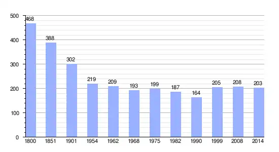 Los datos demográficos contemplados en este gráfico de la comuna de Marcei[4]se han cogido de 1800 a 1999 de la página francesa EHESS/Cassini, y los demás datos de la página del INSEE.[5]