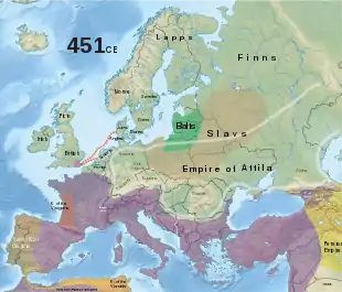 Atila saqueó Metz e intentó un asedio a Orleans, antes de enfrentarse a las fuerzas de Aecio en la batalla de los Campos Cataláunicos, en el noreste de la Galia, que enfrentó a unos 100 000 hombres y provocó grandes pérdidas en ambos bandos; tras la batalla, Atila se retiró a la Gran llanura húngara y Aecio disolvió su coalición de tribus, enviándolas de vuelta a sus propios territorios. En la primavera de 452 Atila volvió a hacer una incursión en Italia, que se encontraba casi totalmente indefensa, probablemente motivado por un deseo de venganza además de por la necesidad de realizar incursiones para estabilizar su estado tribal, que dependía de las incursiones para obtener botines y recursos. Capturó la ciudad de Aquilea después de un largo y difícil asedio y la saqueó,[22] para posteriormente asaltar el norte de Italia, tomando Mediolanum (hoy Milán) y otras ciudades importantes. Se temía que Atila atacara la propia Roma, cuyos muros eran más débiles que los de algunas ciudades que ya había capturado; durante este período, aparte de cortar sus líneas de comunicación y acosar a sus fuerzas de retaguardia, Aecio no lanzó un ataque directo a las tropas hunas.[23]