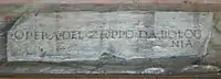 Firma de Marco Zoppo en el retablo del Real Colegio de España, Bolonia.