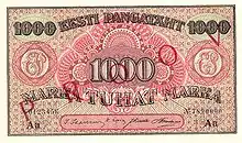 En 1919, se emitieron bonos del tesoro ("kassatäht") con denominaciones de 5, 10, 20 y 50 penni, 1, 3, 5, 10, 25 y 100 marcos, junto con billetes de 50 marcos ("pangatäht"). Más adelante se emitieron bonos del tesoro de hasta 1000 marcos, junto con billetes de hasta 5000 marcos. También se crearon letras de cambio ("vahetustäht"), en 1922, por valores de 10 y 25 marcos.