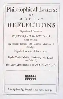 En 1664 Philosophical Letters. El trabajo presenta la filosofía natural de Cavendish y se relaciona con las ideas de Hobbes, Descartes, Henry More, J.B. Van Helmont y otros filósofos del siglo XVII como Robert Boyle y William Harvey. Por ejemplo, Cavendish analiza sus explicaciones mecánicas de la percepción, la luz y los colores, la opinión de que el movimiento puede transferirse y sus puntos de vista sobre las sustancias inmateriales. También discute los límites del conocimiento humano. El trabajo a menudo se interpreta como una respuesta crítica a estos filósofos.