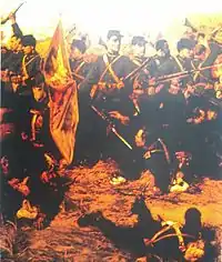 Igualmente merecen distinción especial la escolta del estandarte compuesta de los valientes veteranos, todos premiados... Estos individuos, peleando como leones en defensa de su querido deposito perecieron todos en sus puestos, y antes de morir, tres de los últimos que cayeron, tomaron la oportuna precaución de quemar el estandarte, antes que permitir fuera insultado y mancillado por los enemigos de su patria.Parte del comandante Liborio Echanez, Regimiento "2º de Línea" [4]