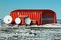 - Hangar de helicópteros de la base Marambio (1970) realizado totalmente en material plástico, siendo en su momento la construcción en ese material más grande existente. La imagen corresponde a su etapa de armado en la base antártica.