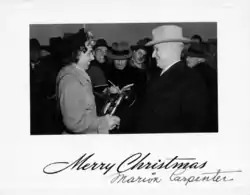 - Tarjeta de Navidad de Marion Carpenter, mostrando a la fotógrafa con Presidente Truman. Truman Biblioteca Presidencial, Accesión #: 58-649.