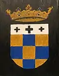 Jaquelado de azur y plata de nueve piezas, con cinco de oro y cuatro azul. El jefe de plata, con una cruz llana, de sable, acostada a diestra y siniestra de dos cruces llanas más pequeñas de lo mismo.