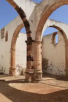 - Y Constanza Sarmiento (n.c.1460), llamada señora de Fuerteventura, que hubo por legado de su madre tres dozavos de las rentas y jurisdicción de dicha isla y la de Lanzarote. Casó en 1478 con Pedro Fernández de Saavedra el Viejo, su sobrino 3.º, veinticuatro de Sevilla, nacido hacia 1463 y finado en Fuerteventura en 1510. El novio era muy mozo al casar,[34] y pese a ello había defendido poco antes la fortaleza de Utrera, en rebeldía contra los Reyes Católicos. El matrimonio se estableció en Betancuria, Fuerteventura, y también tenían casa y mucho arraigo en Sevilla. Pedro Fernández fue un tenaz continuador del empeño conquistador de su suegro; hizo reiteradas entradas en Tenerife junto con Francisco Maldonado, gobernador de Gran Canaria, pero no consiguieron someter a los indígenas.[35] Era hijo segundo del mariscal de Castilla Fernán Arias de Saavedra, señor de Zahara,[3] comendador de Calzadilla en la Orden de Santiago y alcaide de las fortalezas de Tarifa y Utrera, que en 1477 se rebeló contra el Rey Fernando,[36] y de Juana de Mendoza su mujer, señora de la villa de Alcalá de Juana de Orta, donde murió con su marido en 1478 de un temblor de tierra;[37] nieto de Gonzalo Arias de Saavedra, del Consejo del Rey, trece de Santiago y comendador mayor de Aragón, que fue también señor de Zahara, mariscal de Castilla y alcaide de Tarifa y Utrera, y de Inés de Ribera y Moscoso, y materno de Pedro Fernández de Marmolejo, señor de Torrijos, veinticuatro de Sevilla, y de Juana Rodríguez de Esquivel, y biznieto de Fernandarias de Saavedra, señor del Castellar, alcaide de Cañete la Real, y de Leonor Peraza, su mujer (que era hermana de Hernán Peraza el Viejo, señor de las Canarias: hijos ambos de Gonzalo Martel y de Leonor Ruiz Peraza). Procrearon nueve hijos:[38]