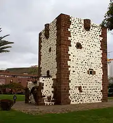 - Casó con Diego (García) de Herrera y Ayala, trece de Santiago y veinticuatro de Sevilla, donde había nacido hacia 1417. Falleció el 22 de junio de 1485 en Betancuria, capital de la isla de Fuerteventura, y fue enterrado en el convento franciscano de San Buenaventura, edificado a sus expensas.[10] Este señor tuvo grandes diferencias con sus vasallos y con la Iglesia sobre el cobro de quintos y diezmos en su jurisdicción. Construyó las torres defensivas de Gando en Gran Canaria, Añaza en Tenerife, y la que hasta hoy se conoce en su memoria como Torre del Conde, en San Sebastián de La Gomera. No llegó a poseer el título de conde de La Gomera, prometido por los Reyes Católicos en las citadas capitulaciones.[4] Era hijo tercero de Pedro García de Herrera, señor de Ampudia[11] y mariscal de Castilla, que tomó Jimena de la Frontera en 1431 y se halló en la de Antequera en 1410, y de María de Ayala su mujer, señora de la casa y valle de Ayala y de las villas de Salvatierra, Salinillas y Berberana, todo en la provincia de Álava; nieto de Garci González de Herrera, mariscal de Castilla, general de la frontera de Lorca, y de Inés de Rojas su mujer, de los señores de Monzón, que era hermana del arzobispo de Toledo Sancho de Rojas y antes estuvo casada con Hernán Gutiérrez de Sandoval; y materno de Fernán Pérez de Ayala, señor de Salvatierra, merino mayor y corregidor de Guipúzcoa, alférez del pendón de la Banda, embajador en Francia durante la minoridad de Juan II, y de María Sarmiento su mujer, señora de Salinillas, hija de los señores de Salinas de Añana.[12] De este matrimonio quedaron cinco hijos:[13]