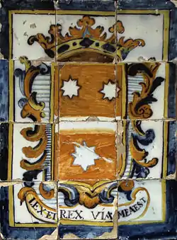 - Un interesante ejemplo de estas mismas armas y lema se encuentra en un galón de librea antiguo, con motivos heráldicos, del que existe una fotografía en el banco privado de imágenes Alamy. Se trata de una cinta de damasco tejida con seda negra, amarilla y anaranjada, sobre urdimbre blanca, y en cuyo dibujo alternan dos escudos, ambos timbrados de corona de marqués: uno trae estas mismas armas, con el lema en bordura, y el otro, de oro, un águila de sable exployada. La descripción asigna a esta imagen el código de identificación 2DMAY13; la atribuye al fotógrafo Artokoloro, con fecha de captura 2 de octubre de 2020, y clasifica el objeto como guarnición (trimming) italiana de principios del siglo XIX. Curiosamente, transcribe mal el lema como «Vis mea est lex et rex», pero en la imagen se ve claramente que reza «Lex et rex via mea est». En Alamy.com. Muy probablemente procede de la casa de los III marqueses de Monteflorido: Antonio Sergeant y Mendívil y Cayetana de Aguilar y Cueto, a quienes corresponden uno y otro escudo.