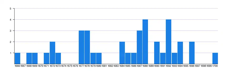 En la secuencia de trabajo alternan los años con libros y sin ellos, al tiempo que se advierten periodos de inactividad relativamente prolongados, como sucede entre 1674 y 1776 —en 1675 viaja a Madrid por negocios—. Entre 1681 y 1683 tampoco imprime libros.