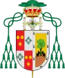 El escudo carga sobre cruz procesional de travesaño único en oro. Suma las armas en su parte central jarrón en plata con las azucenas del mismo metal, escoltada a diestra y siniestra por sendas columnas de Hércules, enlazadas con filacteria en su color con la divisa en sable: «PLVS VLTRA». Supera el primer timbre corona real, timbrada a su vez por capelo arzobispal de sínople con diez borlas del mismo color, repartidas a diestra y siniestra del escudo, en grupos de 1, 2, 3 y 4.[7]