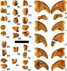 Las garras de la mano son fuertemente curvadas y tienen una joroba grande para la unión del tendón del músculo flexión pero no una proyección en el borde posterior superior. Las garras de mano son tan fuertes que su longitud curvada de la línea de punta en un ángulo recto a la superficie trasera es menor que la altura de dicha superficie trasera. La garra del tercer dedo es casi tan grande como la uña del segundo dedo. La punta de la escápula se ha ampliado. La parte superior de la nalga se redujo transversalmente. El primer hueso metatarsiano se coloca en la parte inferior y se redujo reducido en relación con los otros huesos metatarsianos. Todos los huesos metatarsianos no tienen articulaciones en bisagra del fondo. El cuarto hueso metatarsiano en la parte inferior justo por encima de los cóndilos se estrecharon. Las garras del pie a través de su estrecha y curvada con fuerza. La garra del primer dedo es la más pequeña.[1]