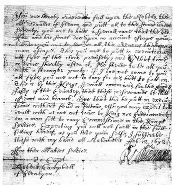 La Masacre de Glencoe ocurrió en Glen Coe, Escocia, en la madrugada del 13 de febrero de 1692, durante la era de la Revolución Gloriosa y del Jacobismo. La masacre comenzó simultáneamente en tres emplazamientos —Invercoe, Inverrigan y Achacon— aunque la matanza tuvo lugar en toda la zona durante la persecución de los MacDonald. En total, 38 MacDonald, del clan MacDonald de Glencoe fueron asesinados por los invitados que habían aceptado su hospitalidad, con el motivo de que los MacDonald no habían actuado prontamente para prometer lealtad al nuevo rey, Guillermo de Orange. Otras cuarenta mujeres y niños murieron a la intemperie después de que sus hogares fueran quemados.