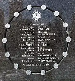 Marc Lépine, de veinticinco años de edad, armado legalmente con un rifle semi-automático y con un cuchillo de caza disparó contra veintiocho personas, matando a catorce de ellas —todas mujeres— e hiriendo a las otras catorce antes de suicidarse. Comenzó su ataque entrando en una de las clases de la Universidad donde separó a los estudiantes entre hombres y mujeres. Después de clamar que estaba «luchando contra el feminismo» le disparó a las nueve mujeres del aula, matando a seis de ellas. Después, anduvo por los pasillos, la cafetería y un aula, seleccionando especialmente mujeres para dispararles. Mató a catorce mujeres, hirió a cuatro hombres y a diez mujeres en veinte minutos de disparos, antes de apuntarse a sí mismo y suicidarse.