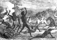 - Hasta 100 aborígenes murieron en represalias llevadas a cabo en respuesta a la masacre de Faithfull,[75][76][77] también conocida como la batalla de Broken River y según el historiador Chris Clark «una batalla que los aborígenes ganaron».[78] El 11 de abril, junto al río Broken en Benalla, un grupo de unos 18 hombres, empleados de George y William Faithfull, buscaban nuevas tierras al sur de Wangaratta para su ganado, cuando fueron atacados por unos 20 australianos indígenas[79] (posiblemente como represalia por el asesinato de varios aborígenes en Ovens por los mismos ganaderos). Al menos un Koori y ocho europeos murieron. Hubo informes de represalias en Wangaratta y en Murchison (dirigidos por la policía nativa bajo el mando de Henry Dana y en compañía del joven Edward Curr, quien dijo que discrepaba de los informes oficiales). Se registraron otros incidentes en Mitchelton y Toolamba.[80]