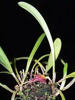 Es una especie de orquídea de pequeño tamaño, que prefiere el clima fresco al frío, con pelo insertado, con hábitos de epífitas, terrestres o litófitas con tallos cilíndricos con una única hoja apical, lineal, carnosa, obtusa. Florece con hojas muy fragantes y flores solitarias en una delgada inflorescencia, erecta a arqueada de 10 cm de largo. La floración se produce en la primavera y el verano. Las características distintivas de esta especie son la inflorescencia corta con las flores entre las hojas, con tubo floral y la base del labelo cordada.[1]