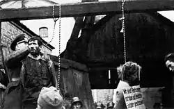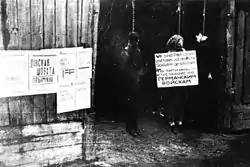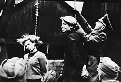 ![]() Masha Bruskina antes de su ejecución con un cartel en el pecho, donde hay una inscripción en alemán y ruso que dice: "Somos partisanos que disparamos contra las tropas alemanas", 26 de octubre de 1941. | ||