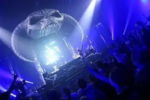 - Angerfist: Danny Masseling[8] comenzó a producir hardcore a sus 16 años. Después de enviar una demostración de su trabajo a BZRK Records, Buzz Fuzz, propietario de esta notoria casa discográfica, lo contactó paratrabajar con él. Comenzó con el alias Menace II Society, luego pasó a llamarse Kid Morbid, para finalmente pasar a llamarse Angerfist. Su máscara y sudadera las lleva con el fin de crear un ambiente oscuro en sus actuaciones.[9]Foto de Angerfist